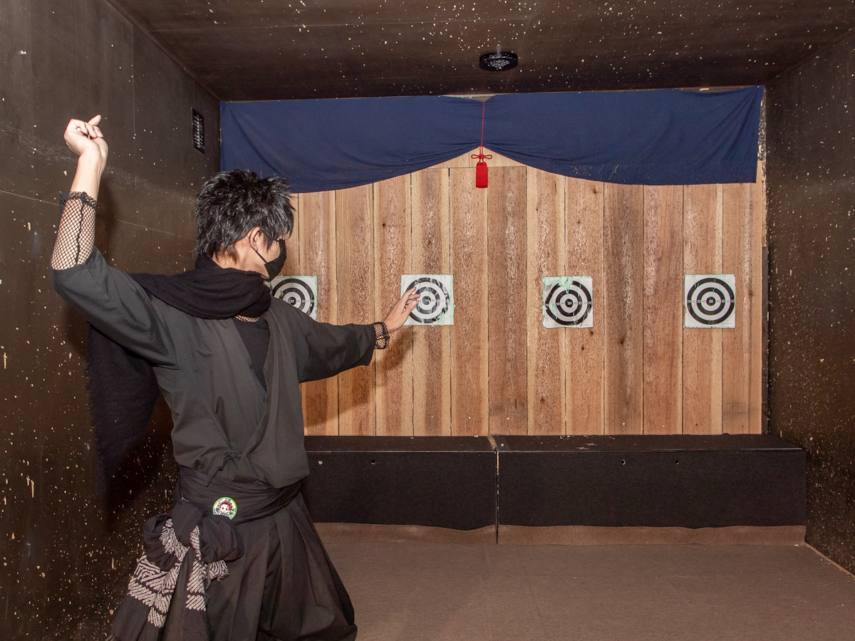 その得意な武器である手裏剣を的に向かって投げられる実践道場です。