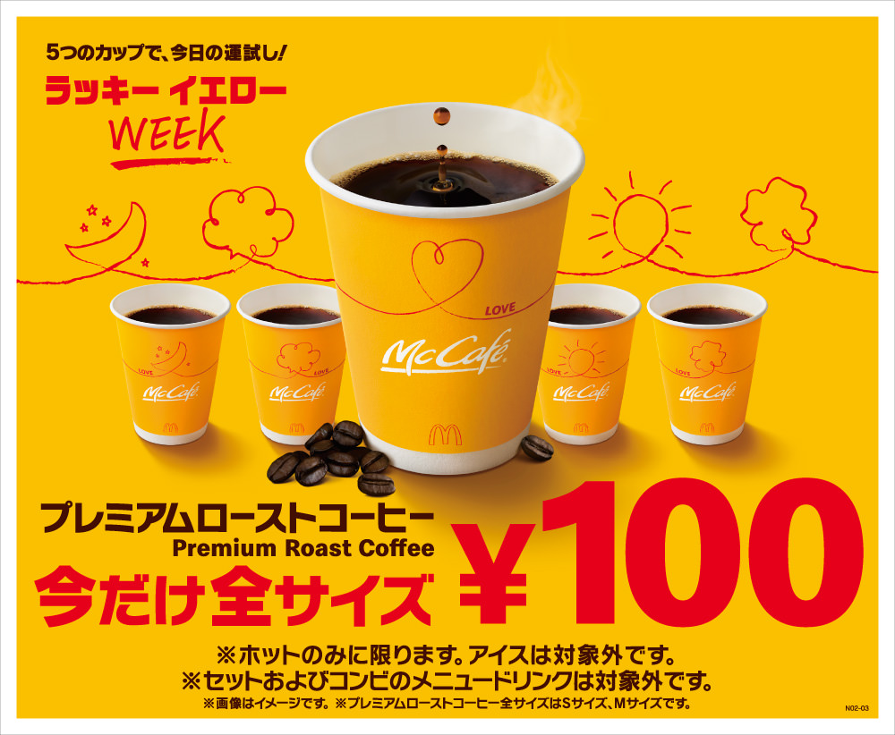 2022年のスタートとして、2022年1月12日(水)から1月25日(火)の2週間、「プレミアムローストコーヒーホット」全サイズを、特別価格100円(税込)で提供する「ラッキーイエローウィーク」を全国のマクドナルド店舗で開催します。