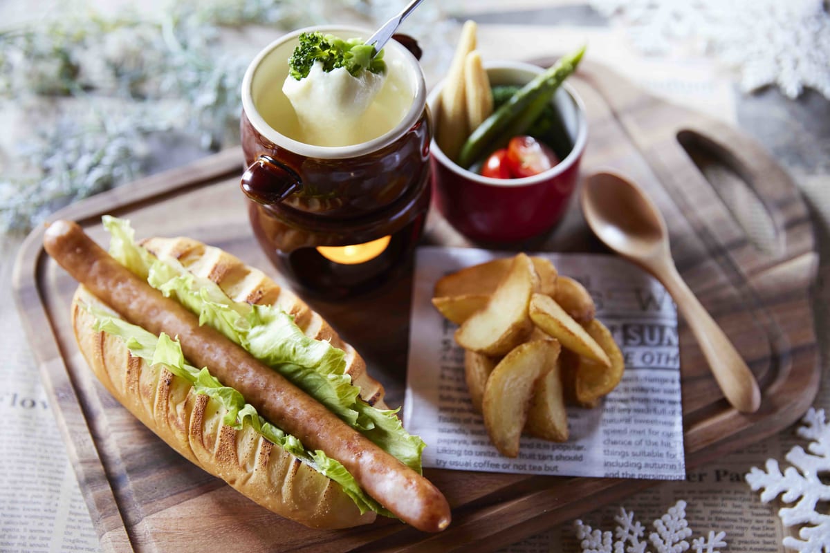 のびるチーズを野菜だけでなくホットドッグとも楽しめる、ボリューム満点のプレートです。
