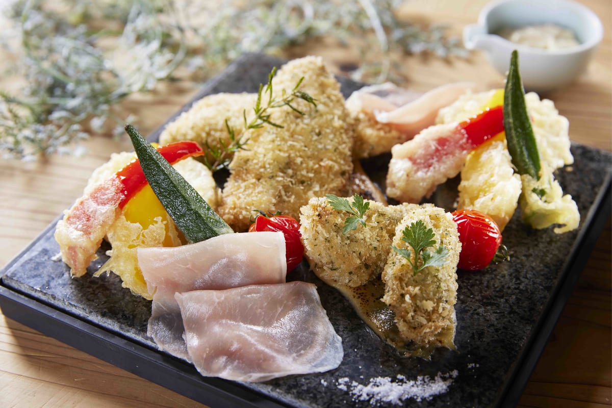 ハウステンボスで栽培されているオーガニック野菜と地元でとれた旬の牡蠣を使った一品。
