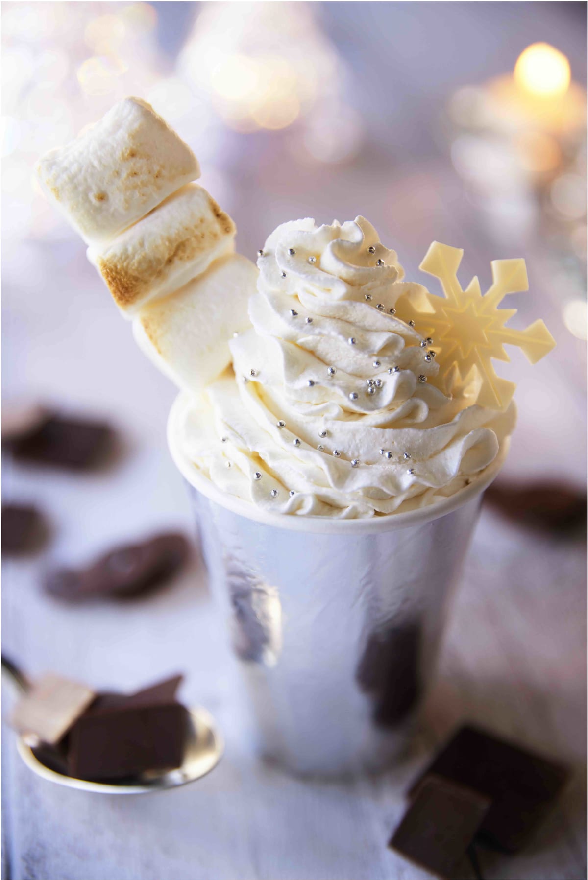 とろとろの焼きマシュマロとたっぷりのホイップクリームを添えた、ぜいたくなホットチョコレート。