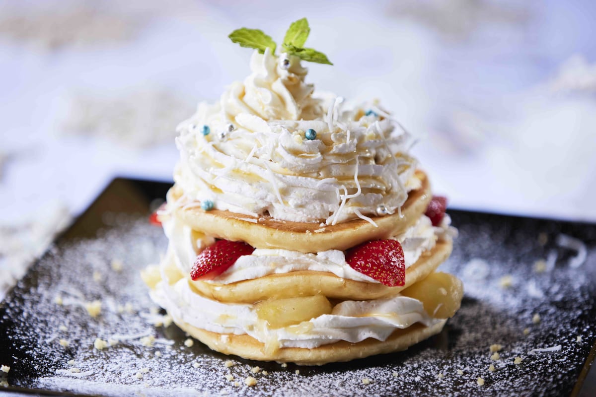 甘いりんごのコンポートと旬のいちごを使い、白銀の塔をイメージして濃厚なホイップクリームをたっぷりしぼったボリューム満点のパンケーキ。