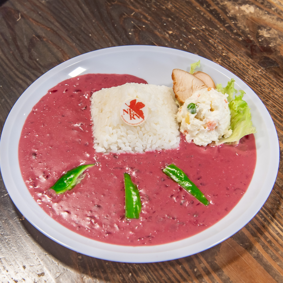 紫色のカレーと鮮やかな緑のピーマンで、エヴァンゲリオン初号機のカラーを表現しています。
