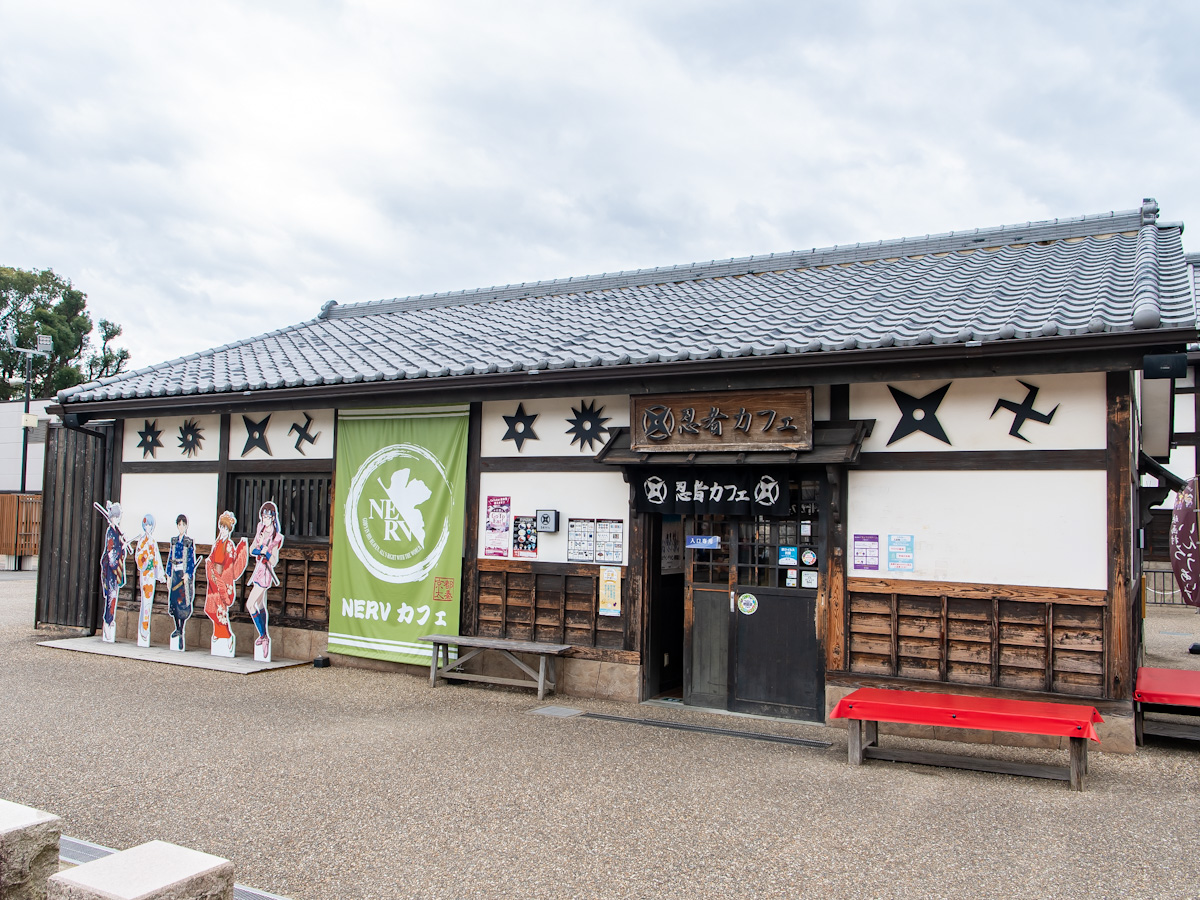 映画村内の「忍者カフェ」は「NERVカフェ」として営業中。