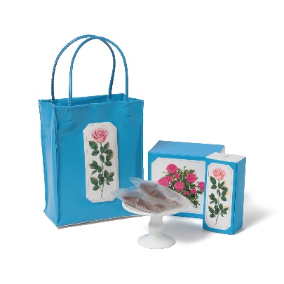 「ルル メリー」のショコラサブレのパッケージを飾る、アイコニックな花のイラストを使用したトートバッグ。