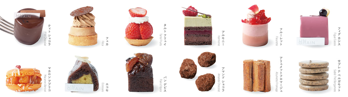 ティト ショコラ、フェカ、タルト フリュイ、アルモニー、フルーレット、フィグ カシス、マカロン アブリコ、エコセ、パン デピス、アマンド ショコラ、アリュメット フロマージュ、サブレ テ ベルガモット