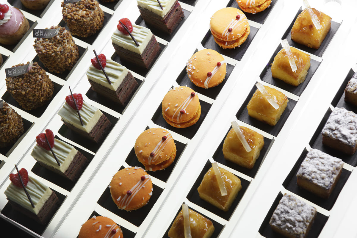 「UN GRAIN」のショーケースには、かわいらしいひとつまみサイズのスイーツがずらりと並んでいて、見ているだけでも幸せな気持ちになれます。