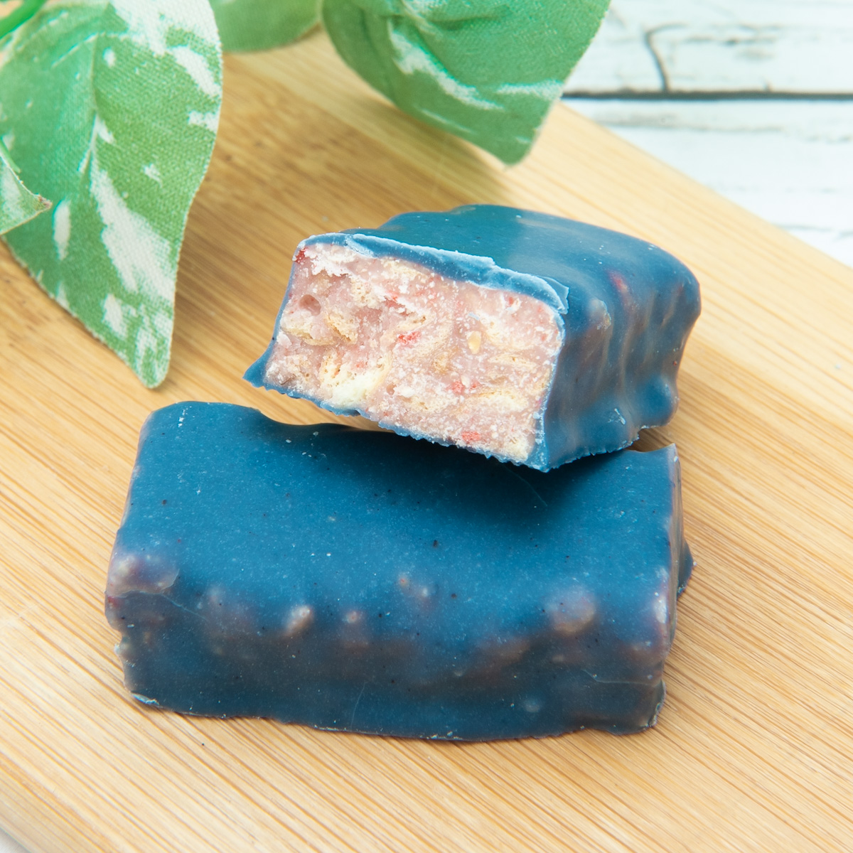 サクサク食感のバタービスケットとフリーズドライいちごに天然の青色色素である「バタフライピー」を使用した青いチョコレートでコーティング。