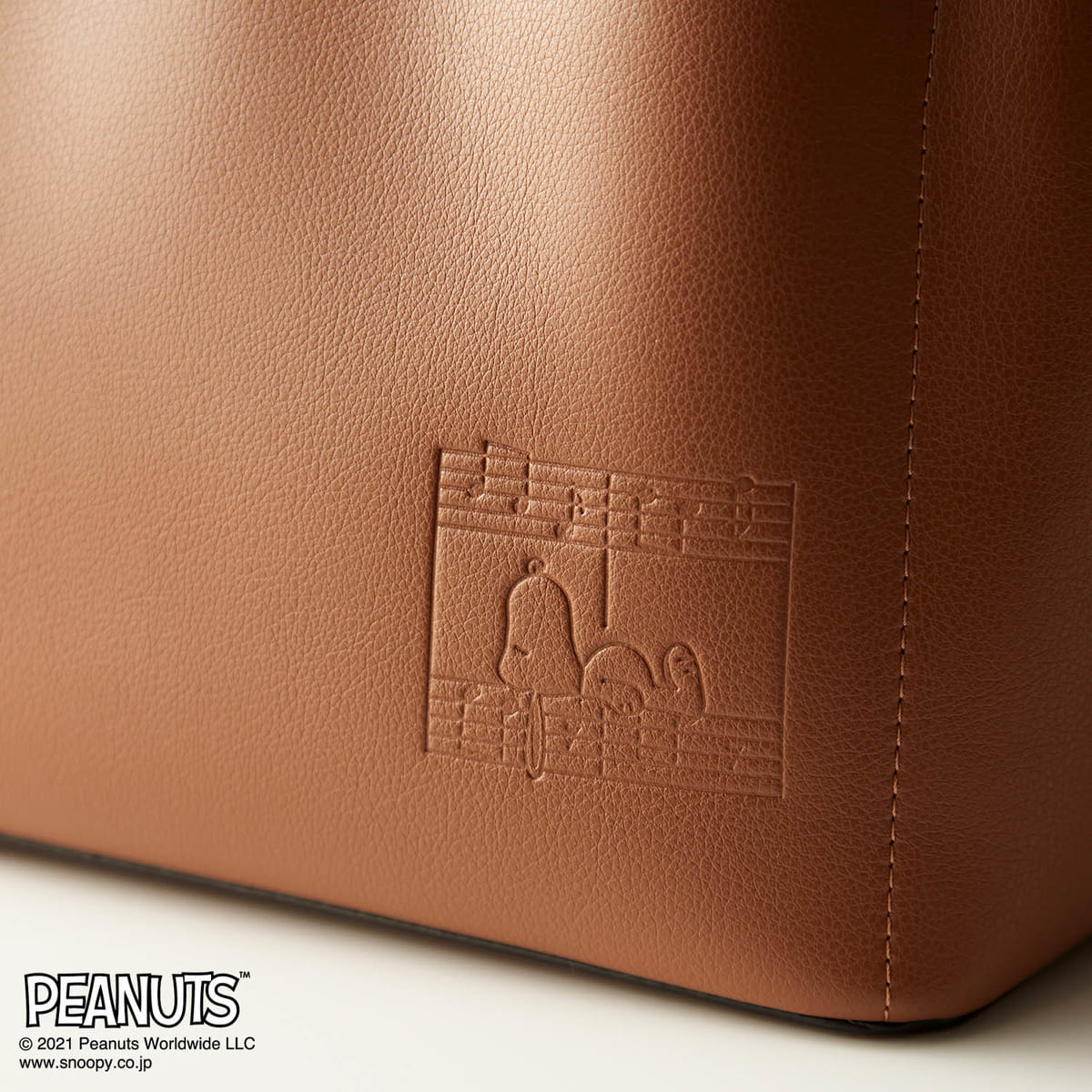 表面には、内側のモチーフに合わせて楽譜に寝そべる「スヌーピー」が型押しされています。