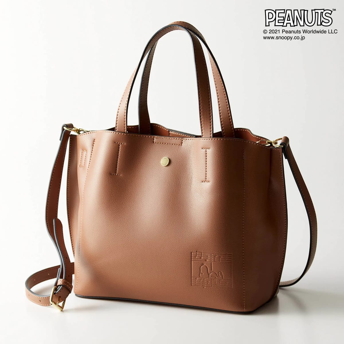 「スヌーピー」2WAYショルダーバッグ(レガートラルゴ) 表に配したピーナッツ柄が愛らしいアクセント(ブラウン)