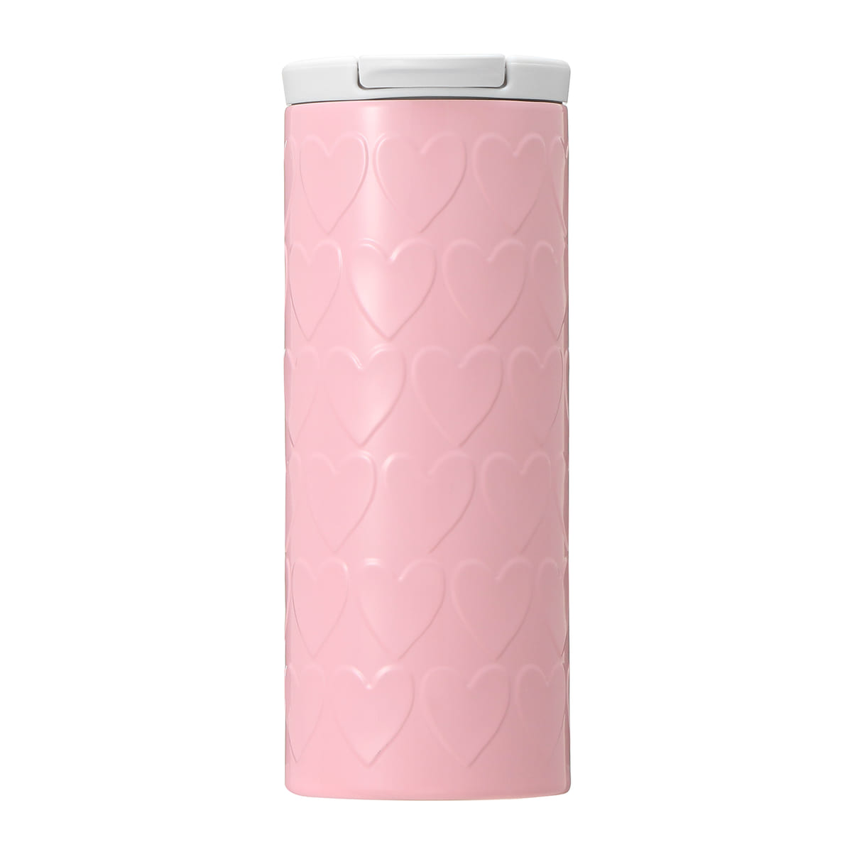 ピンクのボディ全面にハートのパターンが施されたステンレスマグ。