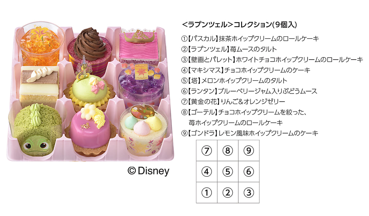 「ラプンツェル」や「パスカル」のほか、夜空に舞うランタン、湖に浮かぶゴンドラなど物語の世界観が9つのプチケーキにデザインされています。