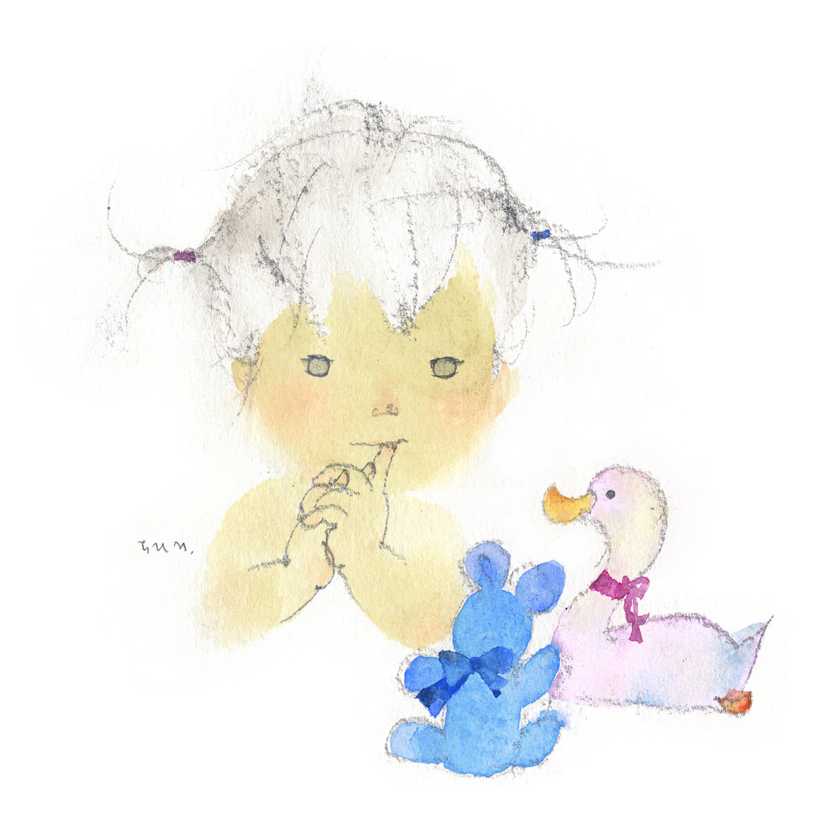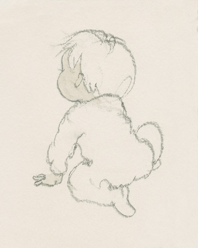 あかちゃんの何気ない姿を切り取った線画は、作品の背景やストーリーまで想起させる余韻のある作品となっています。