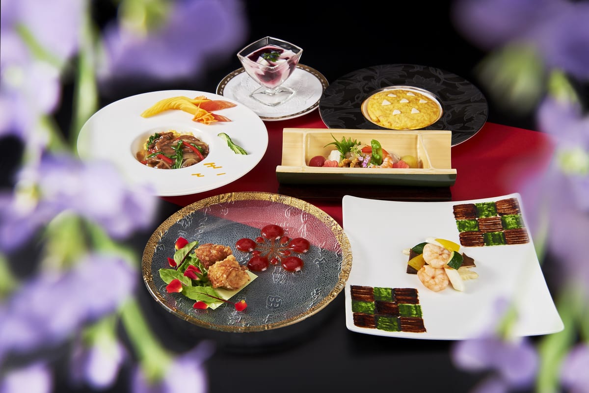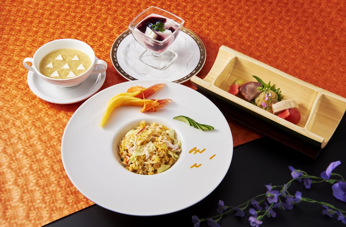 ホテルニューオータニ大阪では「禰󠄀豆子の竹盛り前菜盛り合わせ」をはじめ、シンボルの羽織が彩る大海老の炒めや、炎の形に飾り付けられた特製炒飯などのオリジナルメニューが登場。