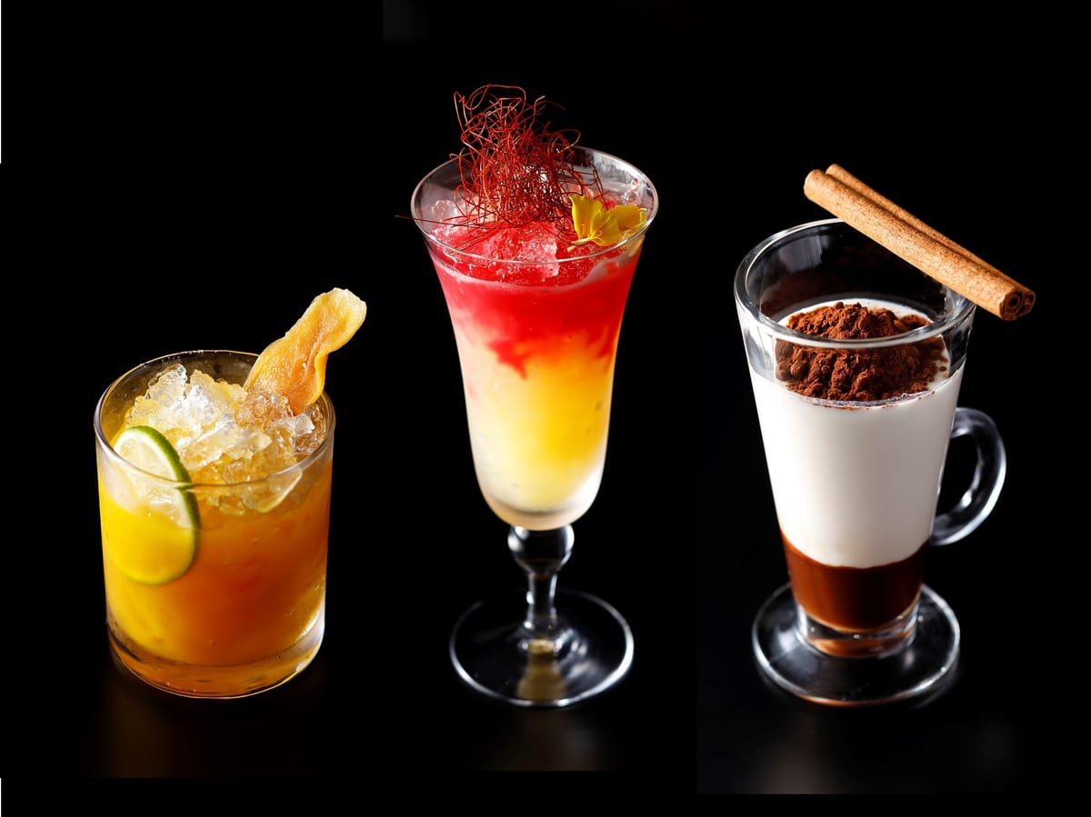 写真は、左が「我妻善逸」、中央が「煉󠄁獄杏寿郎」、右が「嘴平伊之助」のノンアルコールカクテルです。