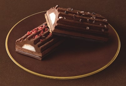 しっとりとした食感のチョコレートスポンジの上に、チョコレートクランチ、ホワイトチョコレートムース、中央にチョコレートクリーム、チョコレートスポンジを重ねた「Uchi Cafe×GODIVA ドゥ クレームショコラ」