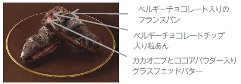 ベルギーチョコレートチップを練りこんだ粒あんと、カカオニブとココアパウダー入りグラスフェッドバターをサンドしたフランスパンです。