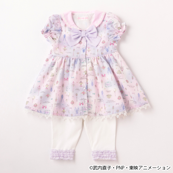 ピンクとラベンダーのぼかし柄をベースに歴代の変身アイテムやおなじみのフレーズをちりばめたチュニックとレギンスのセット。
