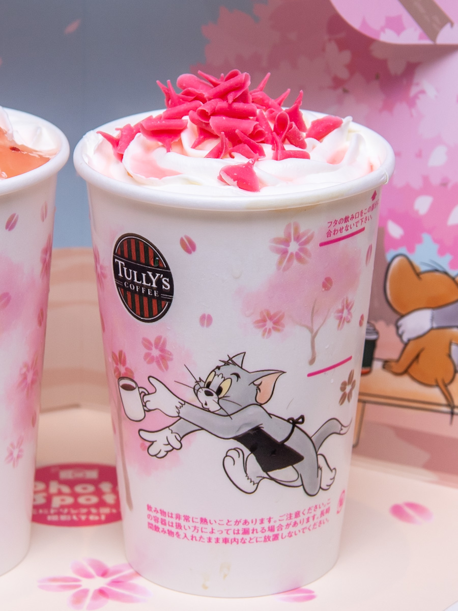 ドリンクは『トムとジェリー』に登場する仲間たちがお花見をしている様子が描かれたデザインカップで提供されます。