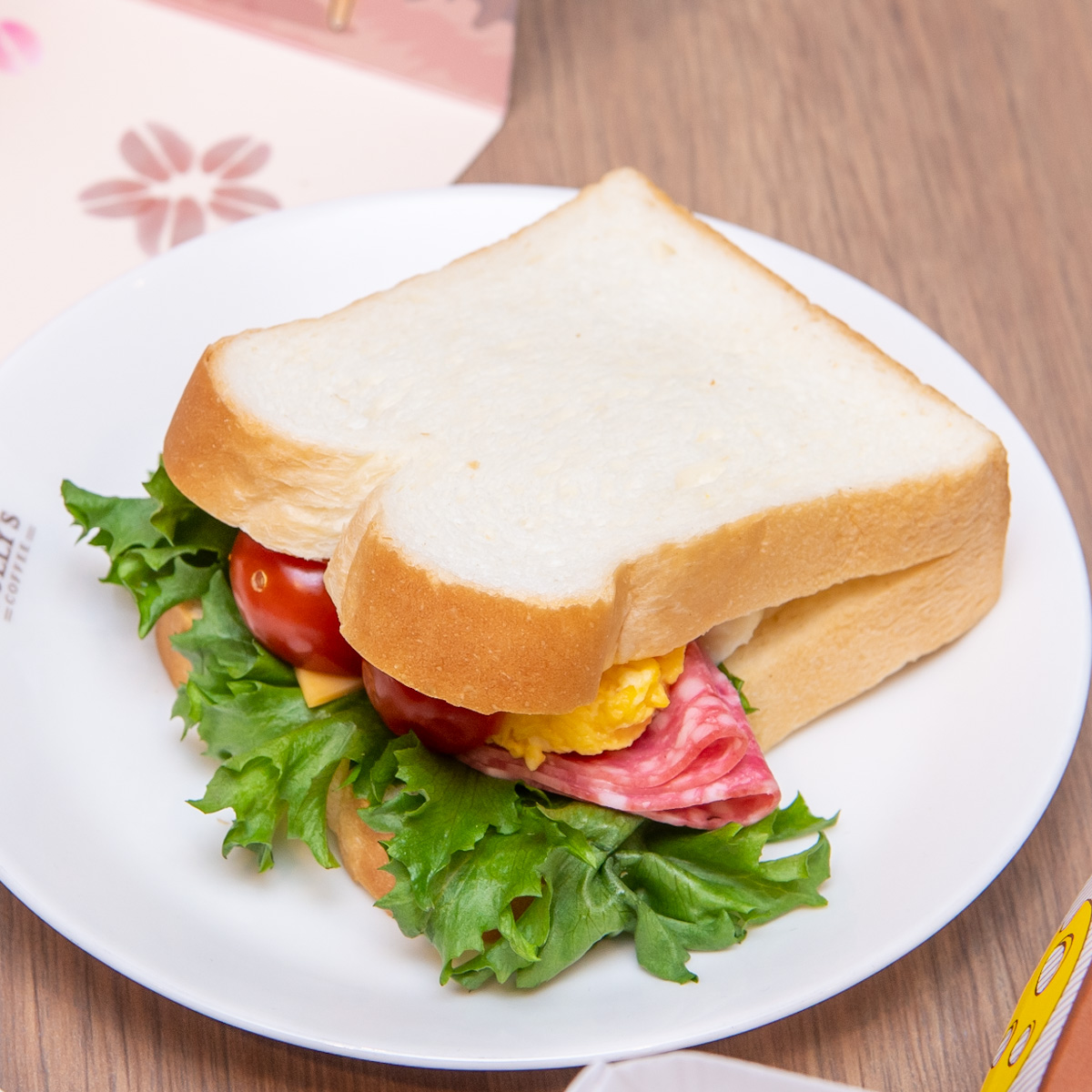 ボロニアソーセージ、スクランブルエッグ、ミニトマト、チーズなど色とりどりの具材を挟んだサンドイッチです。