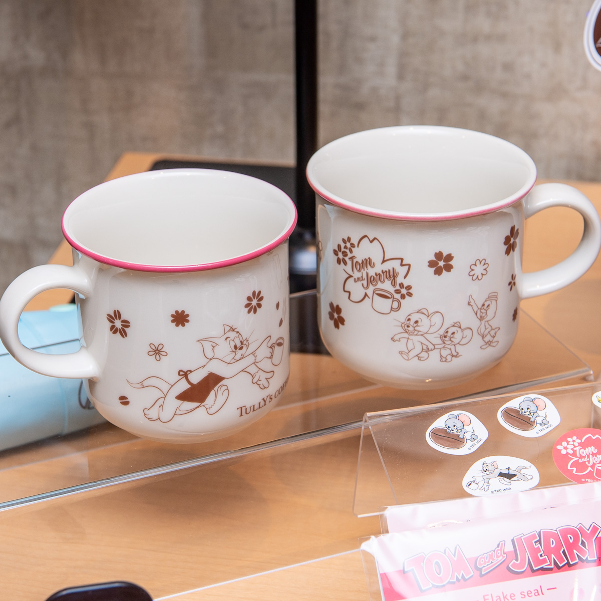 桜やコーヒーの世界に入り込んだ「トム」と「ジェリー」がデザインされたタンブラーやマグカップ、トートバッグなど限定グッズも順次登場。