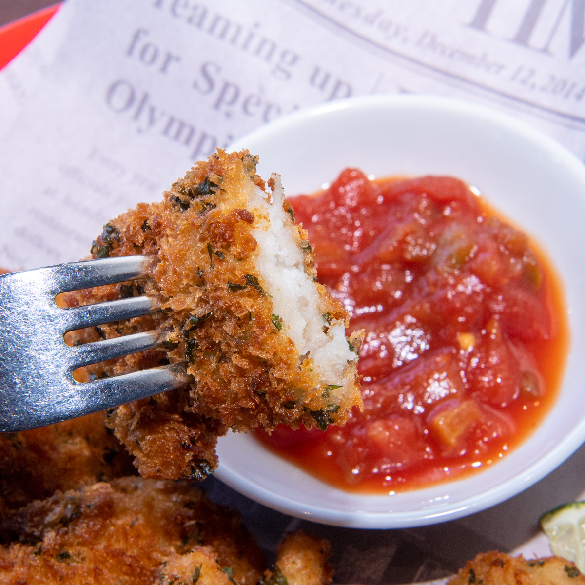 カリっと香ばしい揚げたてのフライを、真っ赤なサルサにディップして味わうメニューです。