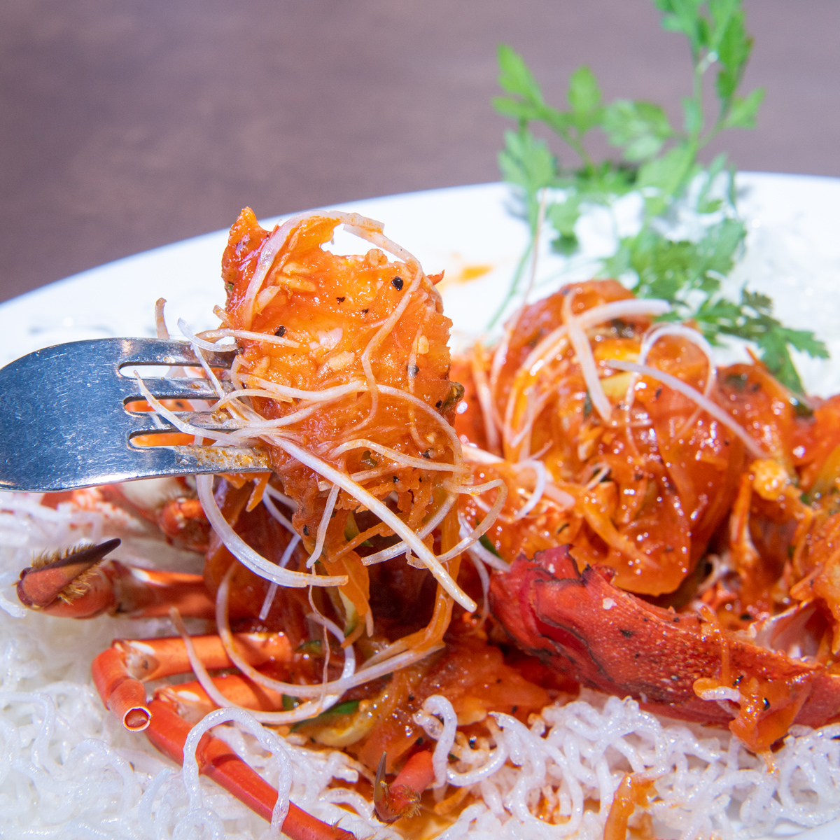 パリパリとした揚げ春雨のベッドの上に鎮座する、一尾丸ごとのロブスターはインパクト抜群です!