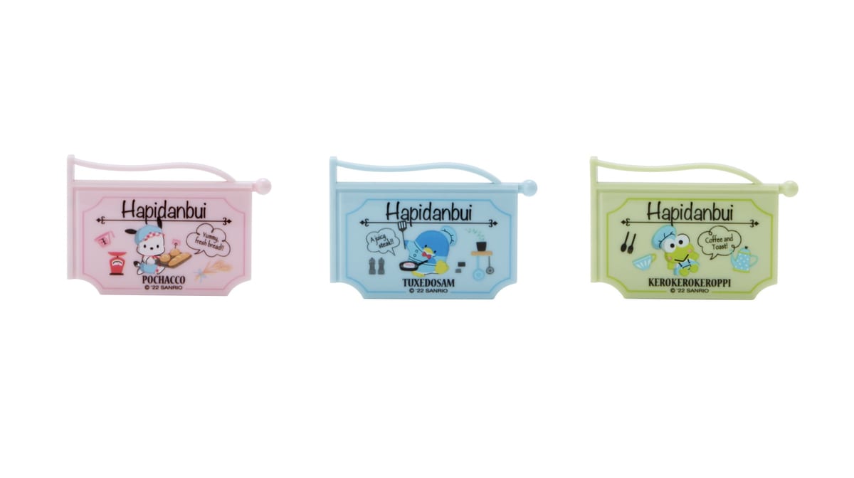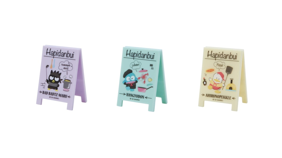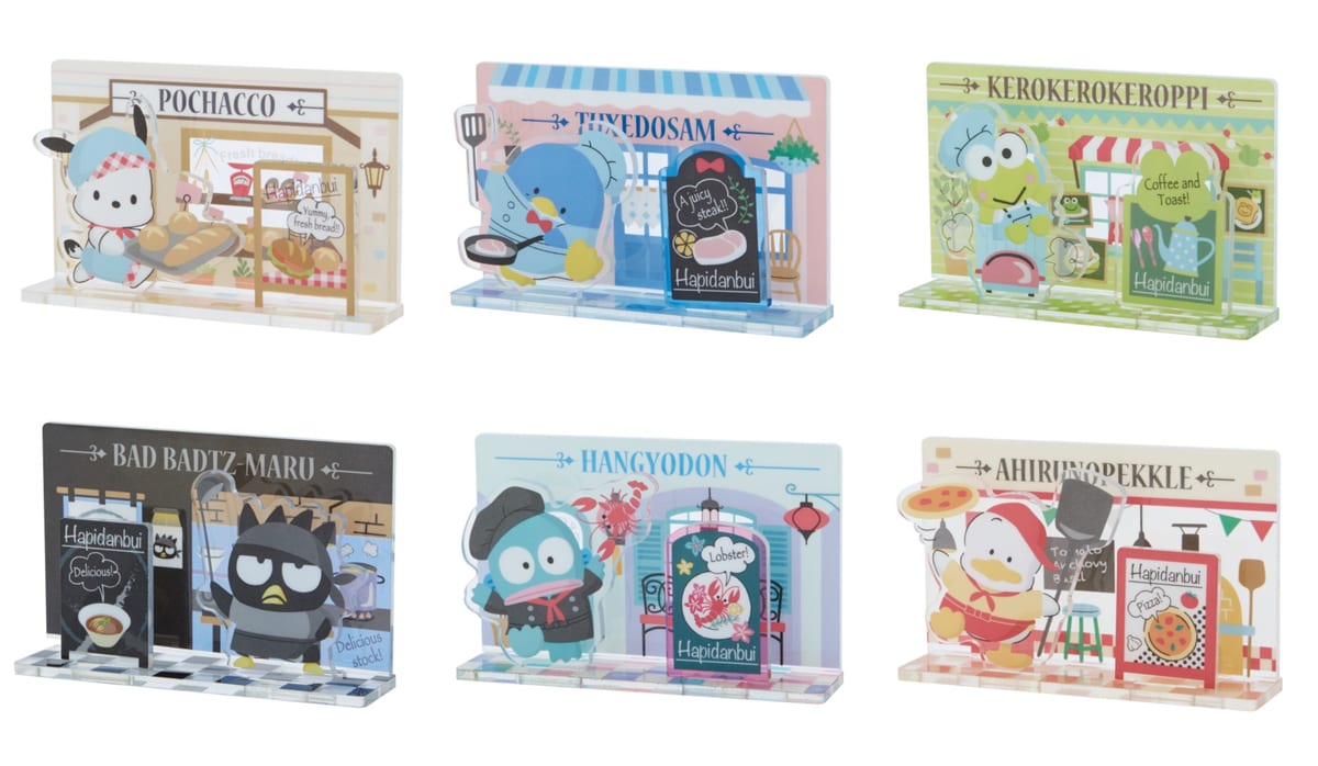 各メンバーがそれぞれの思い描くおいしいお店でお料理に奮闘する姿を表現したもので、「ポチャッコ」はパン屋、「タキシードサム」は洋食屋、「けろけろけろっぴ」はカフェ、「バッドばつ丸」はラーメン屋、「ハンギョドン」は中華料理屋、「あひるのペックル」はピザ屋のデザインになっています。