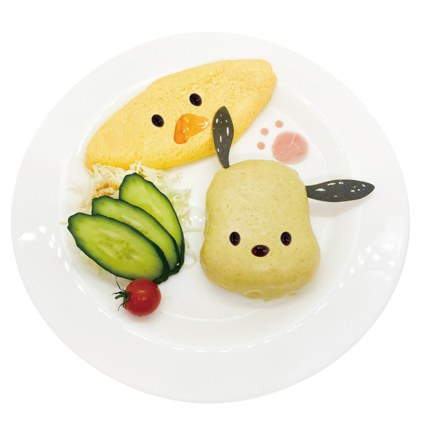 「ポチャッコ」と「ピーチャンズ」のお顔を表現した「ポチャッコのホワイトカレーオムレツ」