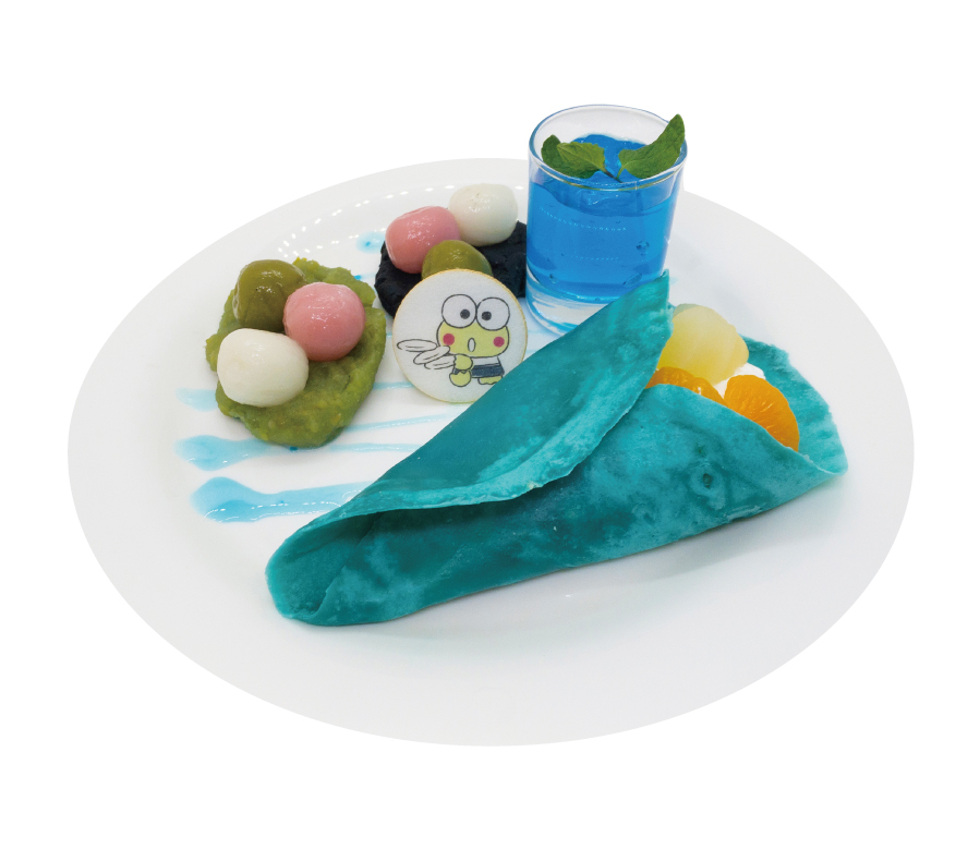 シロップ漬けのフルーツとクリームが入ったクレープのほか、カラフルな白玉や2種の餡、ブルーのゼリーも楽しめる欲張りプレートです。
