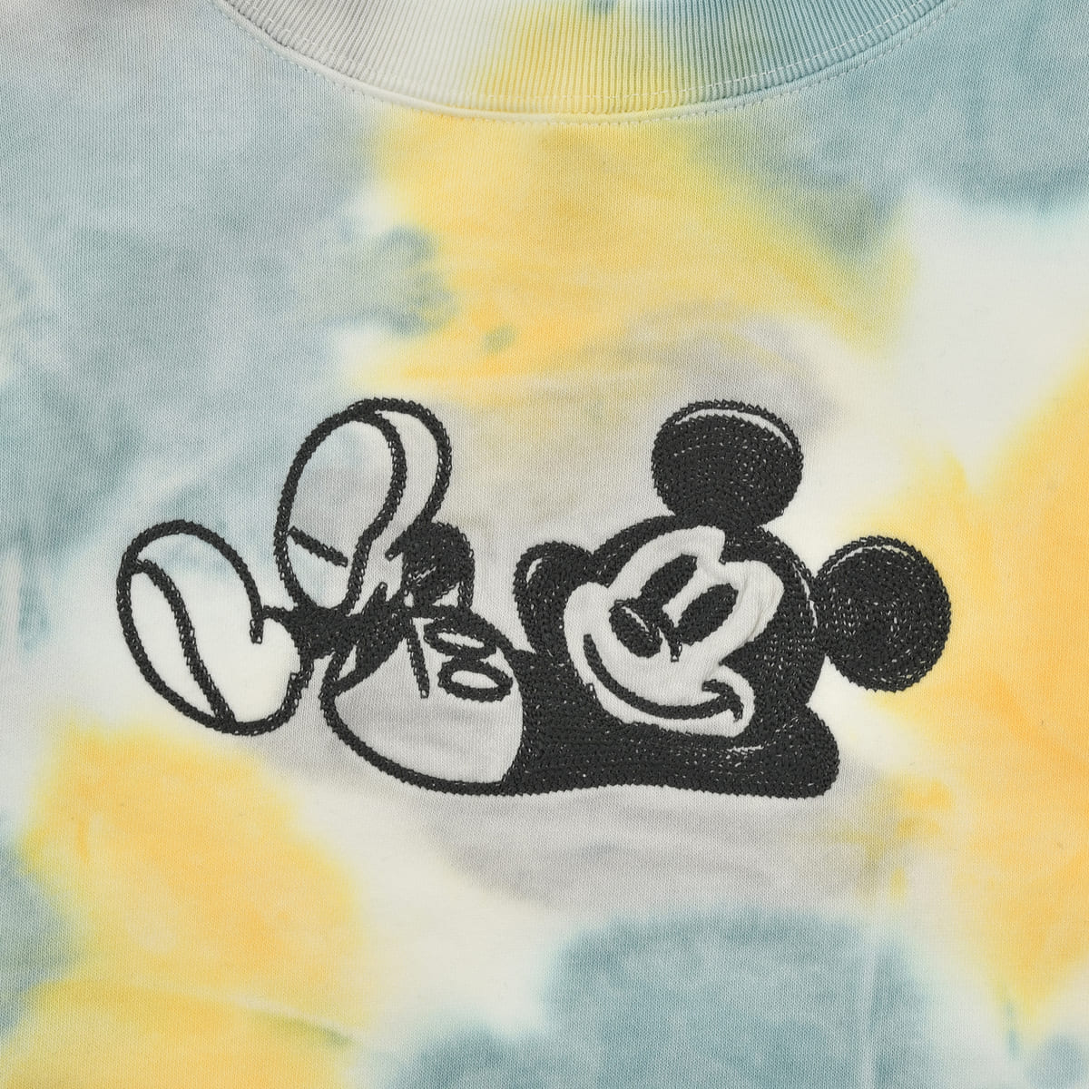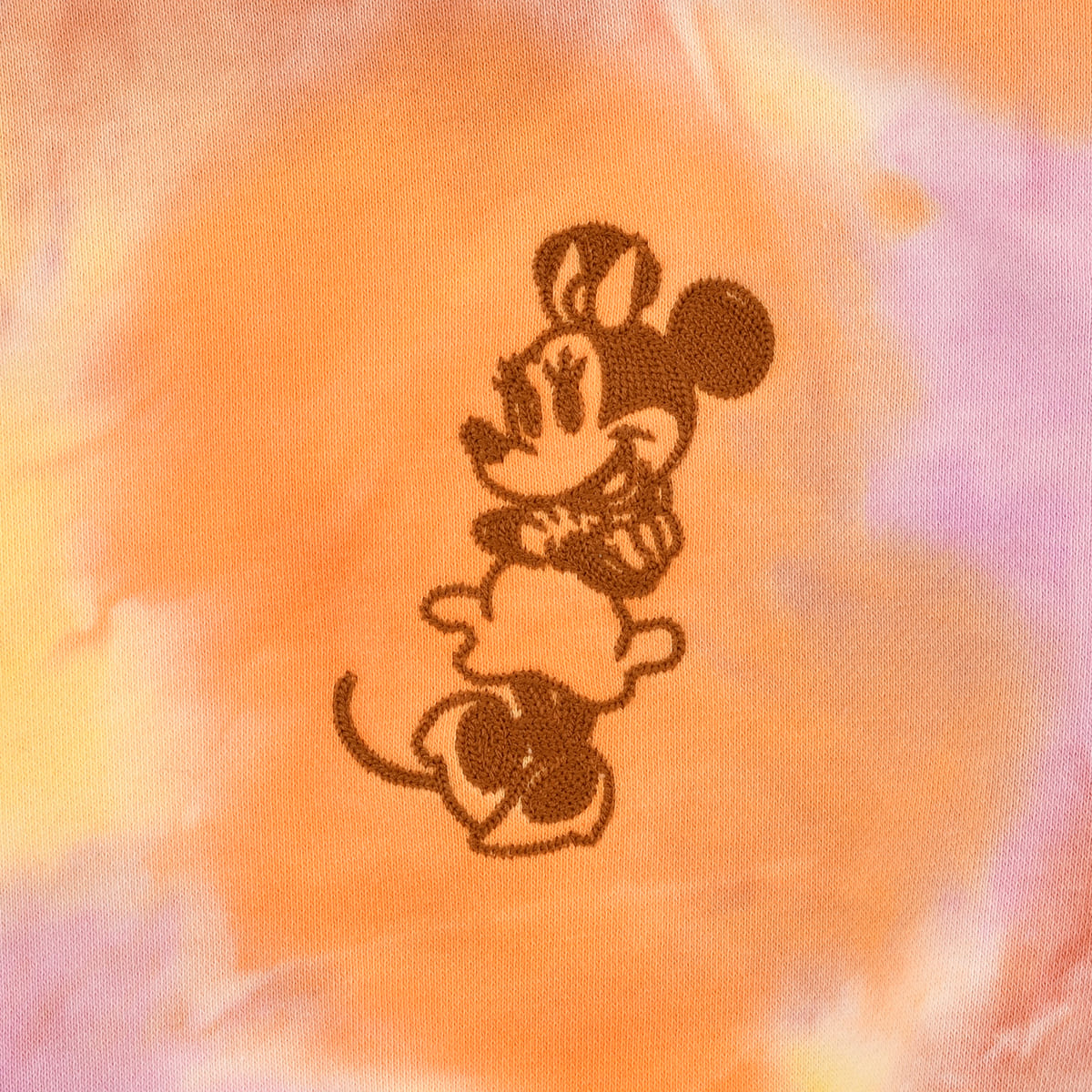 淡い色合いのタイダイ染めに「ミッキーマウス」の刺しゅうが映えるデザインで仕上げられています。