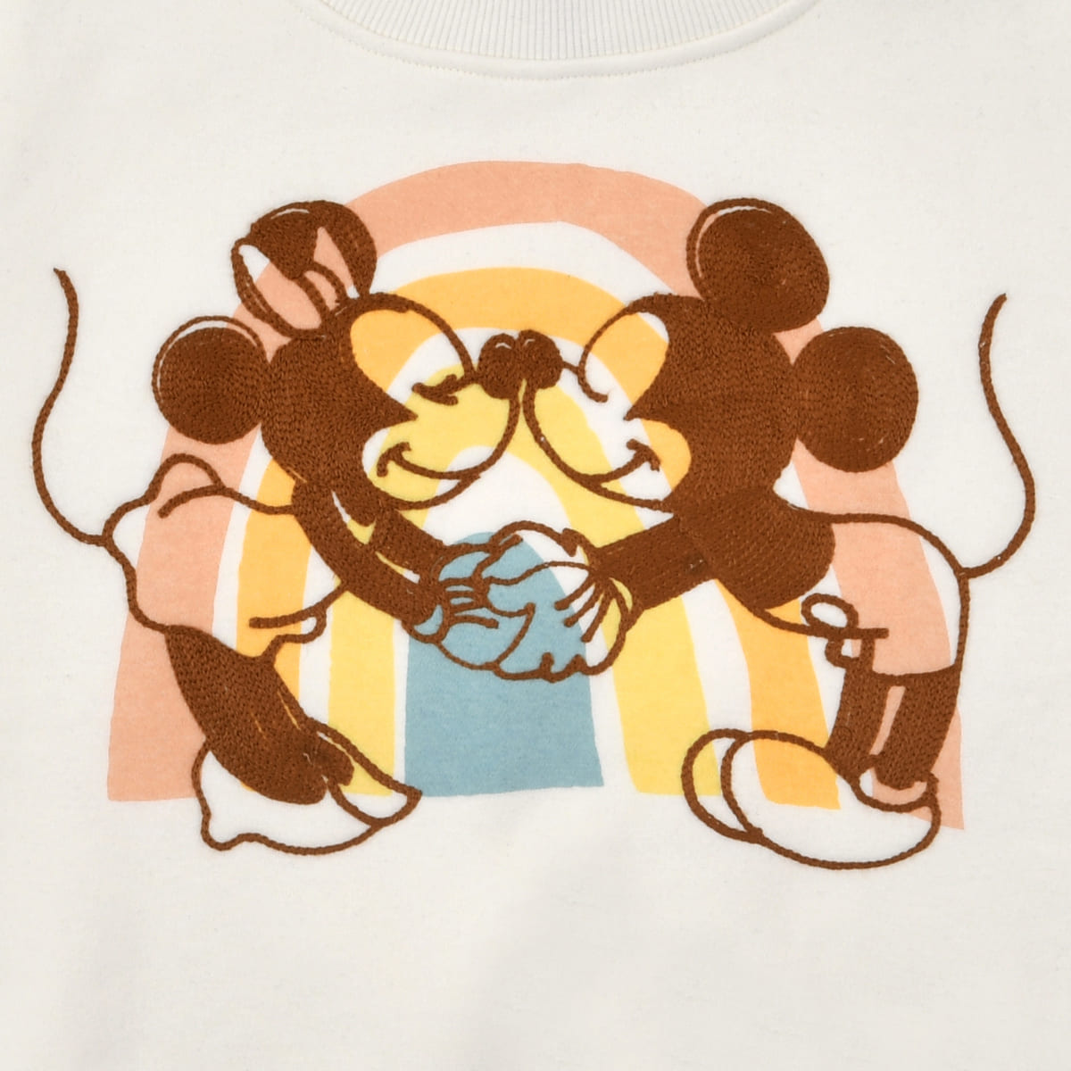 クリーンな白いトレーナーに、鼻キスする「ミッキーマウス」と「ミニーマウス」が刺しゅうされています。