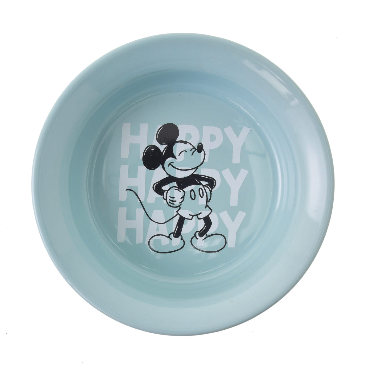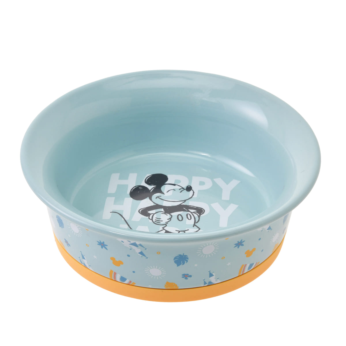 ミッキーアイコンやお城、太陽などのモチーフが散りばめられたペット用フードボウル。