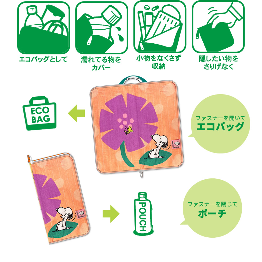 ファスナーを開くとミニエコバッグに、ファスナーを閉じるとポーチになる、これ1つで2役をこなす便利グッズとして活躍してくれます☆