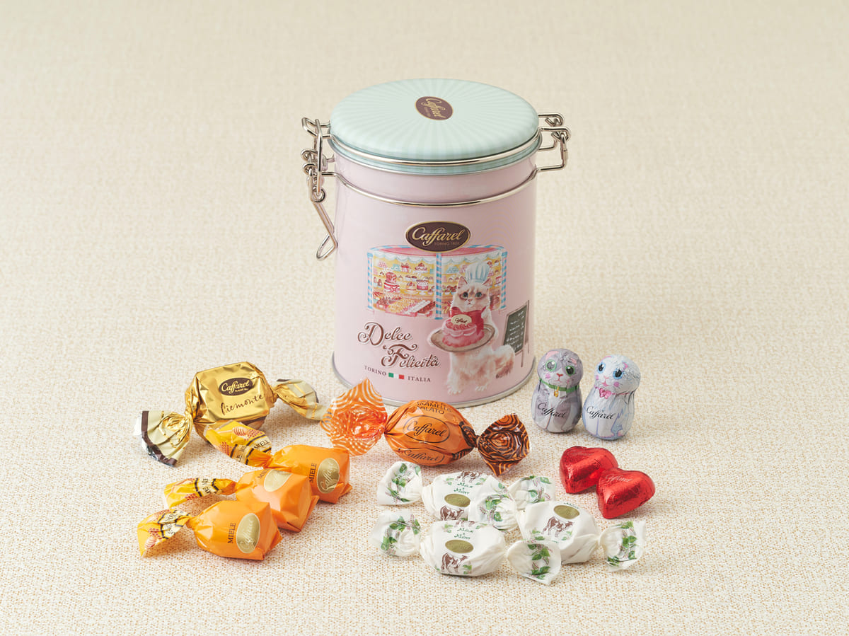 愛らしい猫のパティシエが描かれた缶は、チョコレート6粒、ハニーやラッテメンタのキャンディ6粒の計12粒がアソートされます。