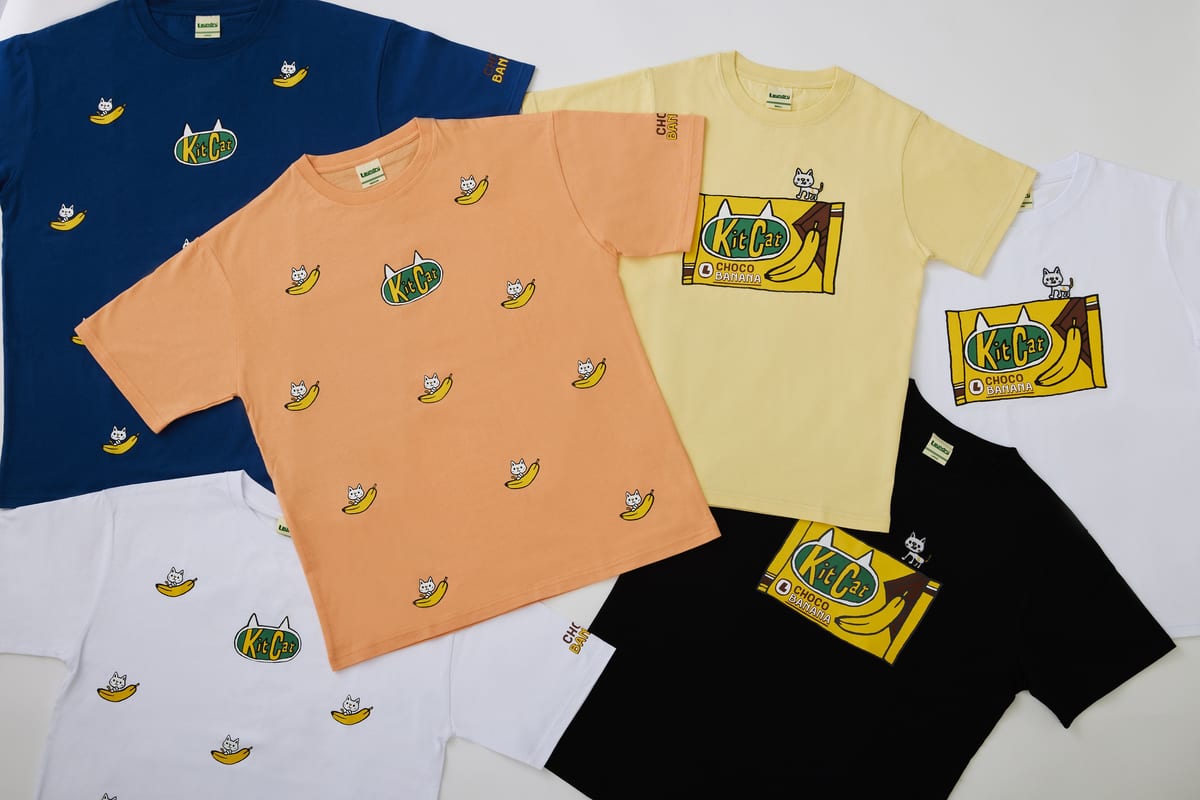 チョコバナナ味のチョコ菓子をイメージした「KITCAT」シリーズのデザインTシャツには、味のあるなんともキュートな「猫」が描かれています。