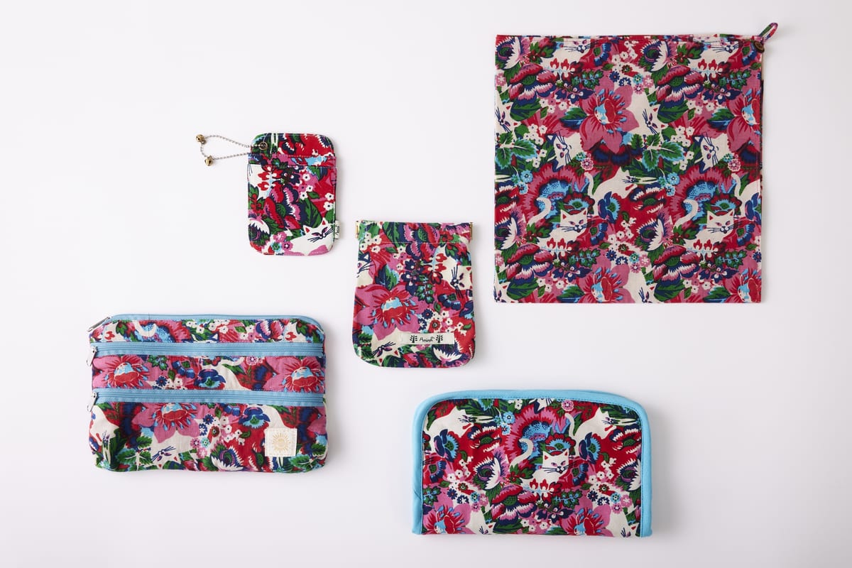 カラフルな大花のパターンの中に白猫が散りばめられているデザインで、パスケース、バンダナ、ポーチ、マルチケースなど幅広くラインナップされます。