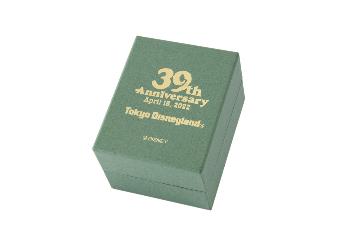 39周年のロゴとミッキーとミニーのチャームが揺れるデザインのピンバッジ。