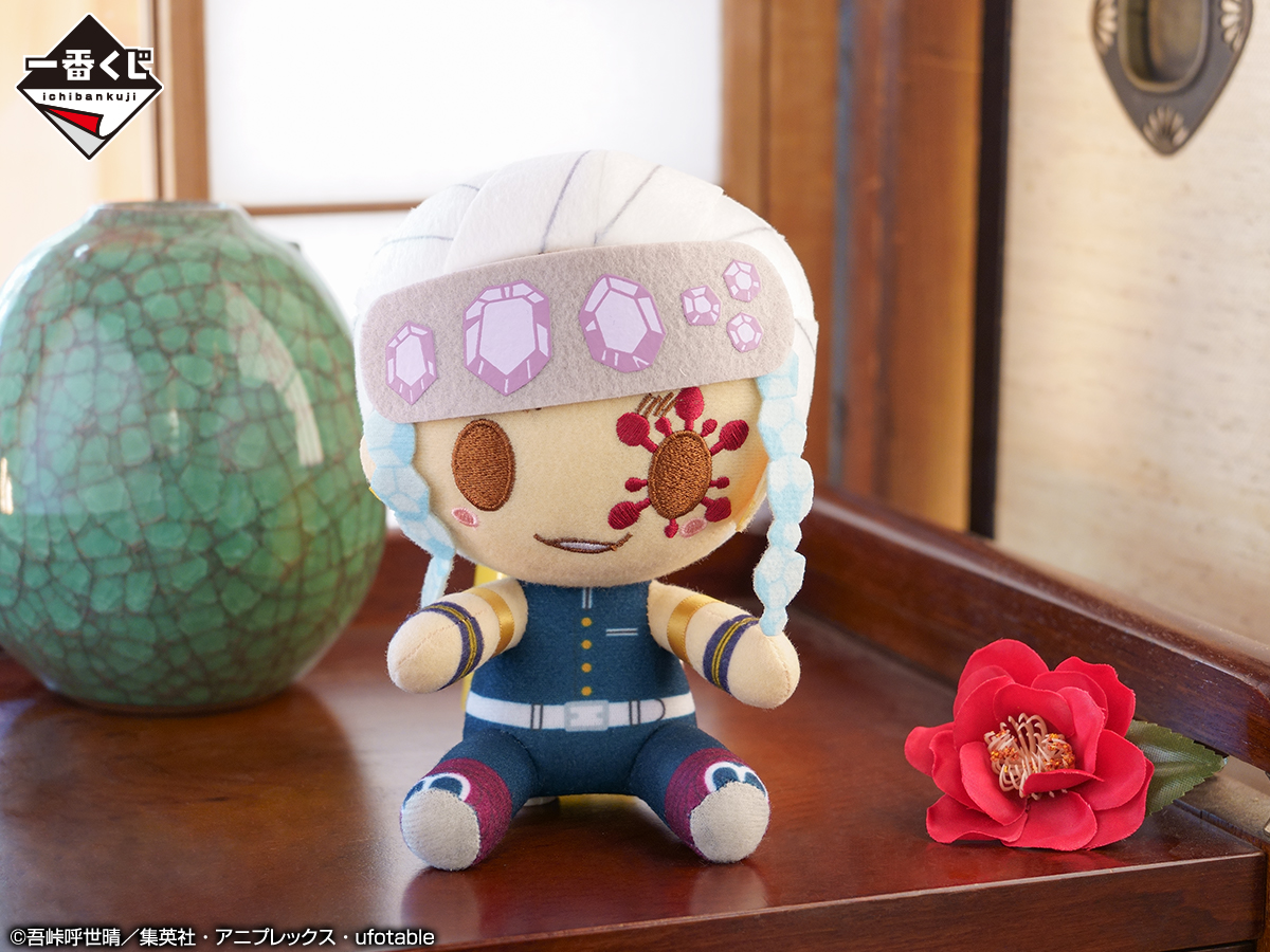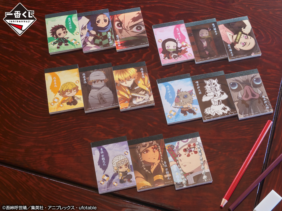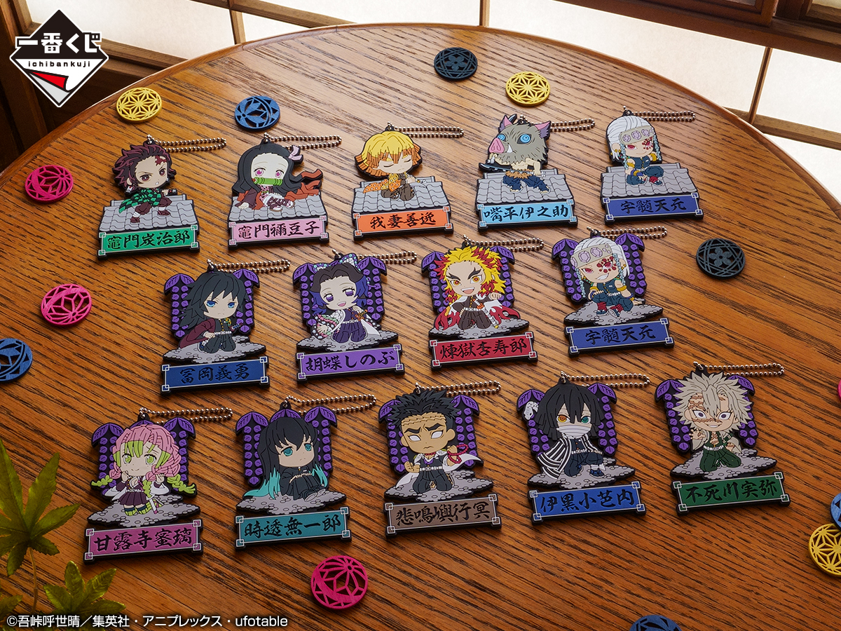 遊郭編で活躍するキャラクターのフィギュアをはじめ、ぬいぐるみ、グラスコレクション、ハンドタオル、メモ帳セット、ラバーマスコットが全10等級39種+ラストワン賞で展開されます。