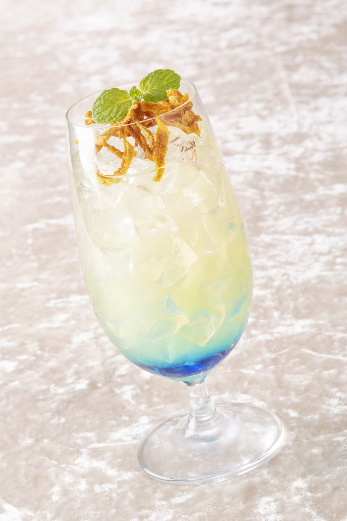 グレープフルーツジュース、ライチーシロップ、ブルーシロップ、トニックウォーター、陳皮、ミント