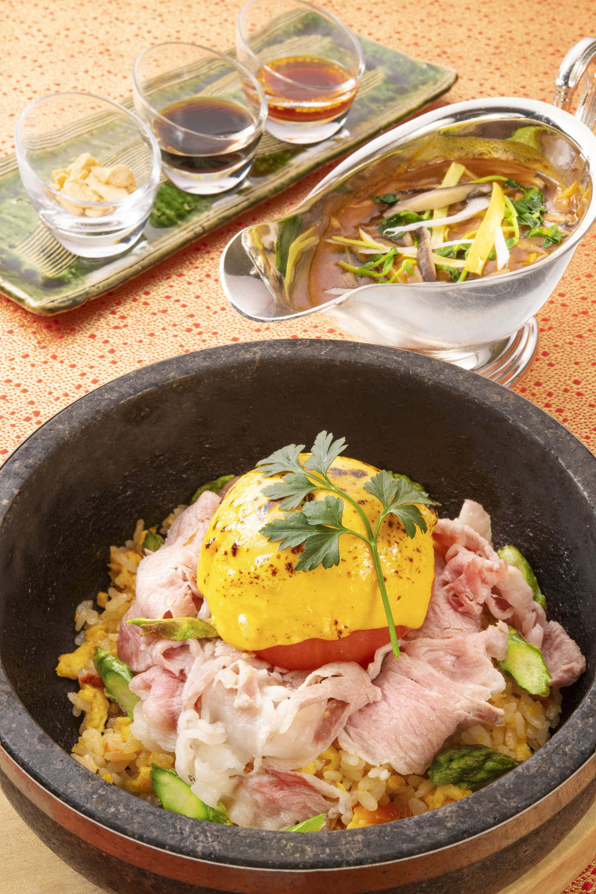 アラカルトメニューに登場する「牛サーロインと焼トマトのサンラーあんかけ石焼炒飯」
