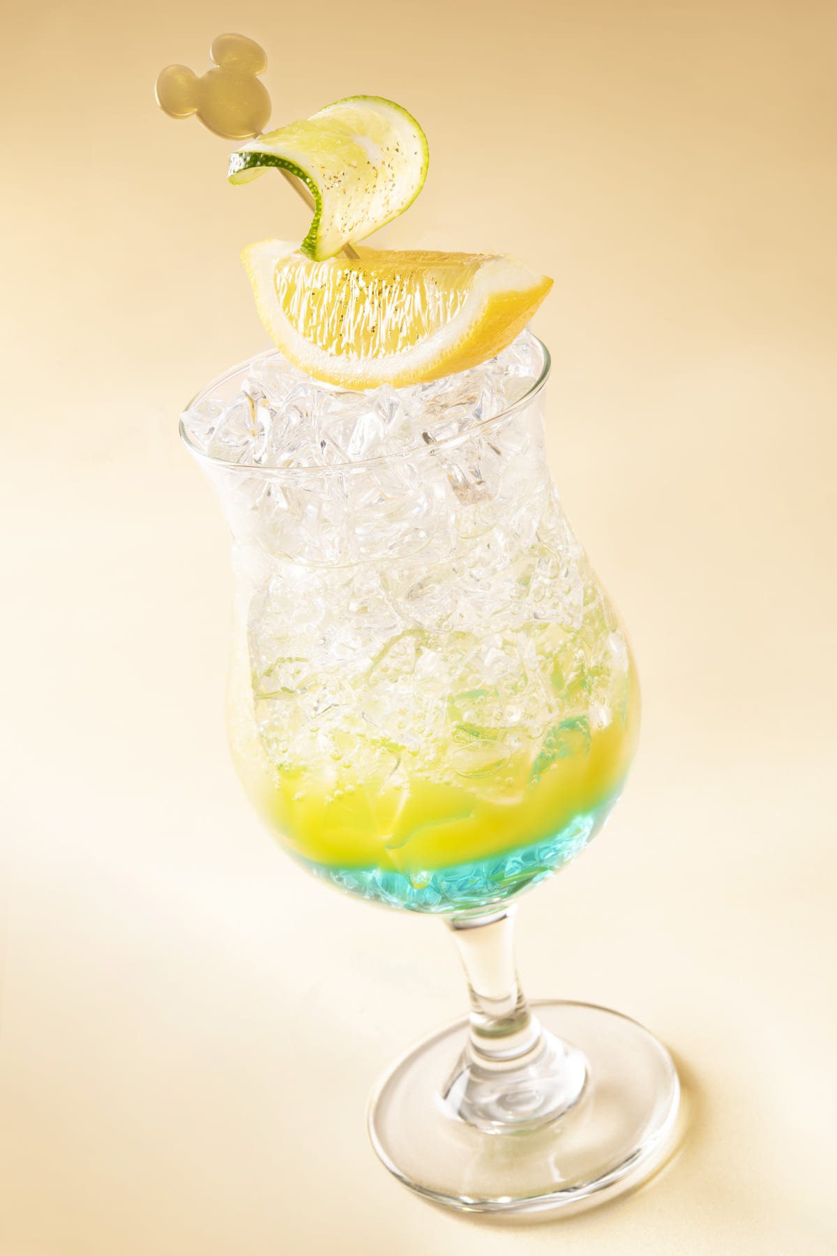 マンゴージュース、グリーンアップルシロップ、ブルーシロップ、レモンジュース、スプライト、レモン、ライム、金粉
