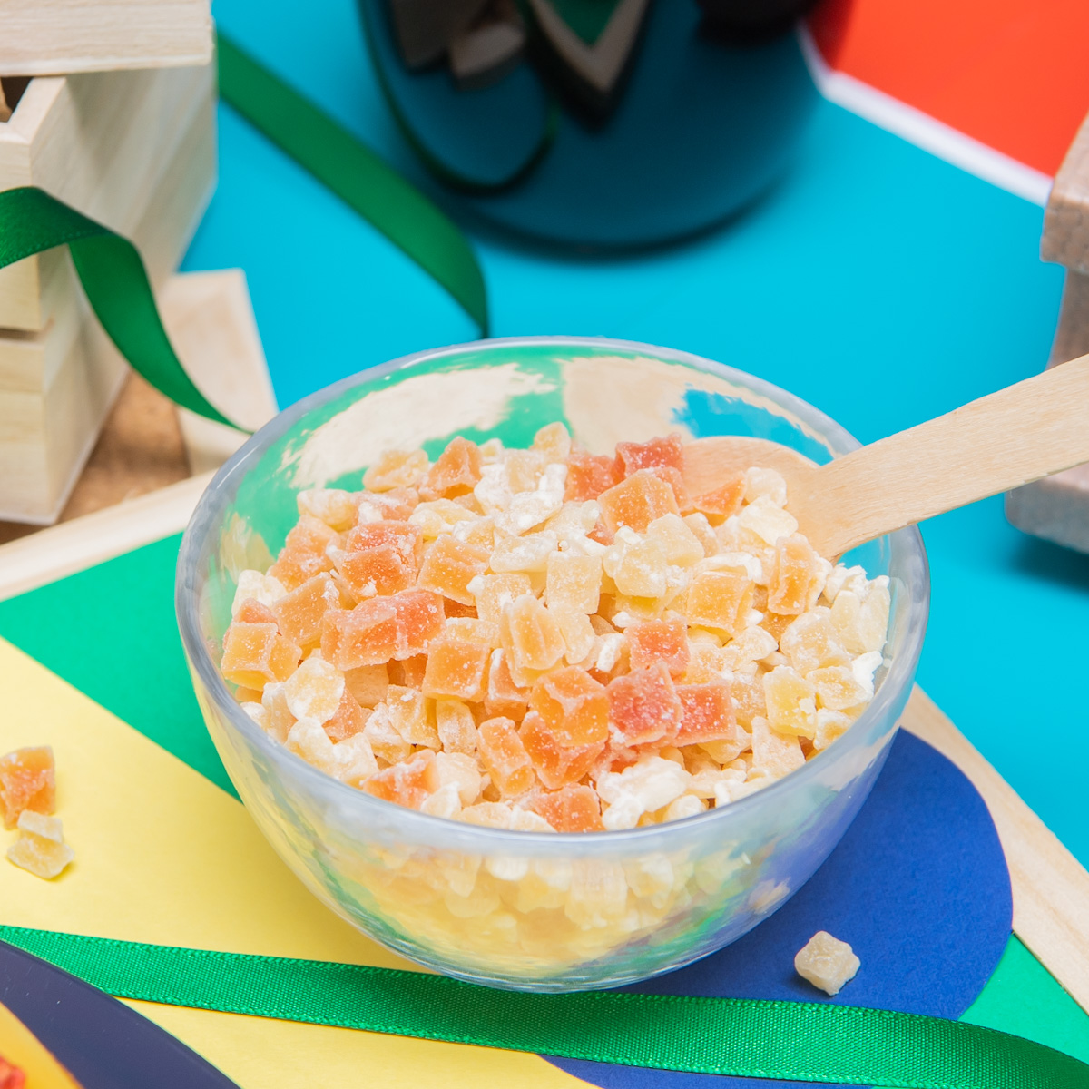 日差しの強いブラジルで馴染み深い「パッションフルーツ」の果汁入りナパージュを、ホワイトチョコに重ねたフルーティな一品。