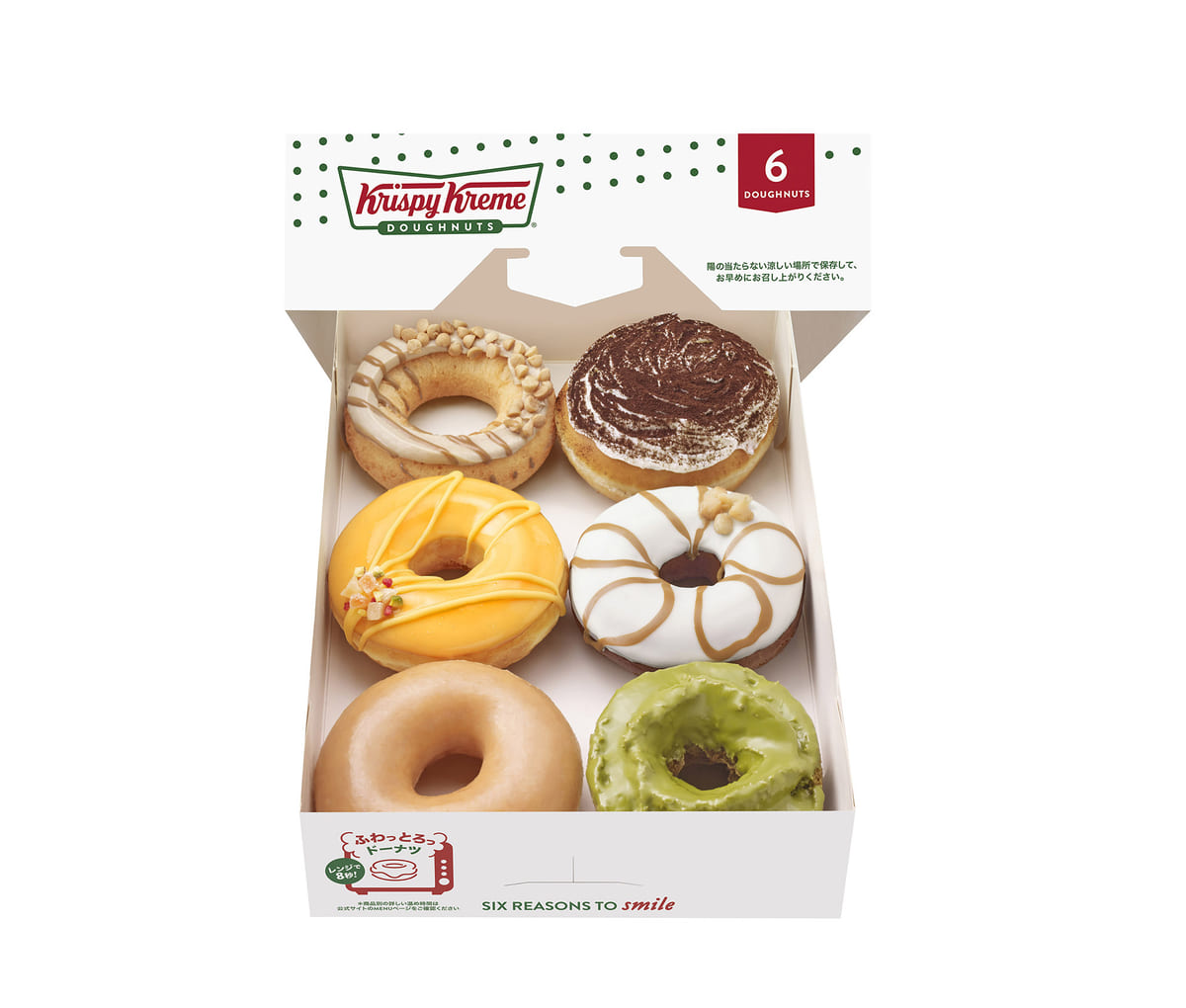 「ティラミス イタリア」「パッションフルーツ ブラジル」「マカダミア チョコ ハワイ」に加え「ムチモチ メープル カナダ」と日本の「抹茶」、世界中で人気の「オリジナル・グレーズド」も楽しめる6個入り!