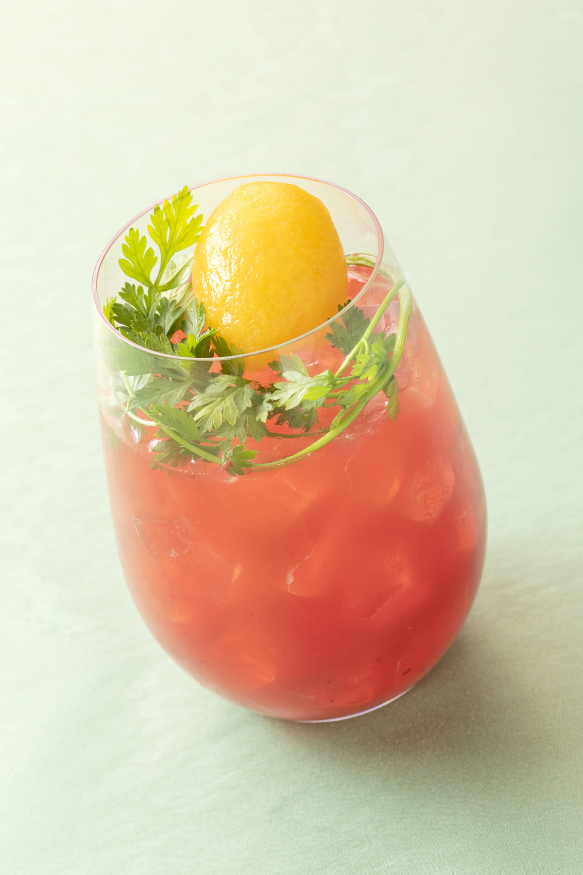 ピーチジュース、アイスティー、ストロベリーシロップ、トニックウォーター、びわ、セルフィーユ