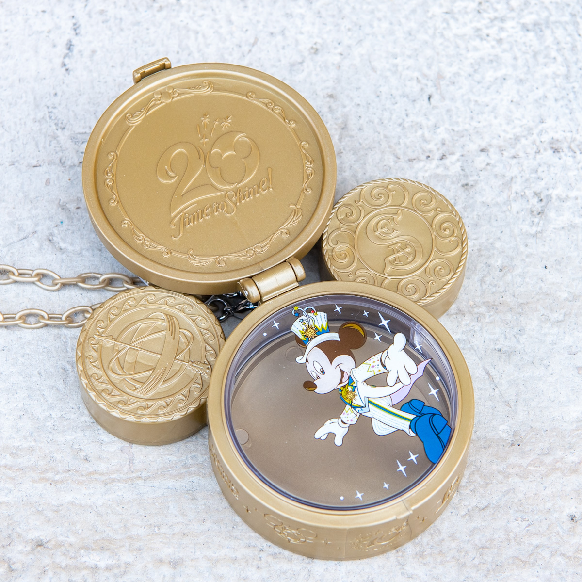 表面には5周年ごとの記念コスチュームを着た「ミッキーマウス」をデザイン。