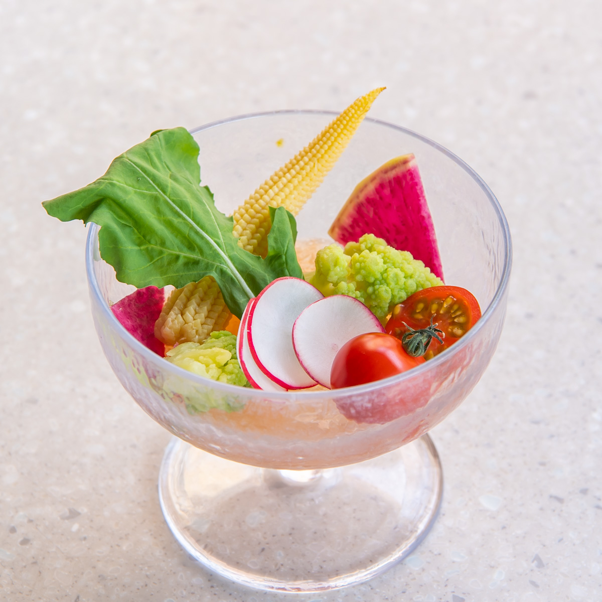 色とりどりの野菜にブラットオレンジやレモンのエキスを入れたジュレを添え、さっぱりとした後味に。