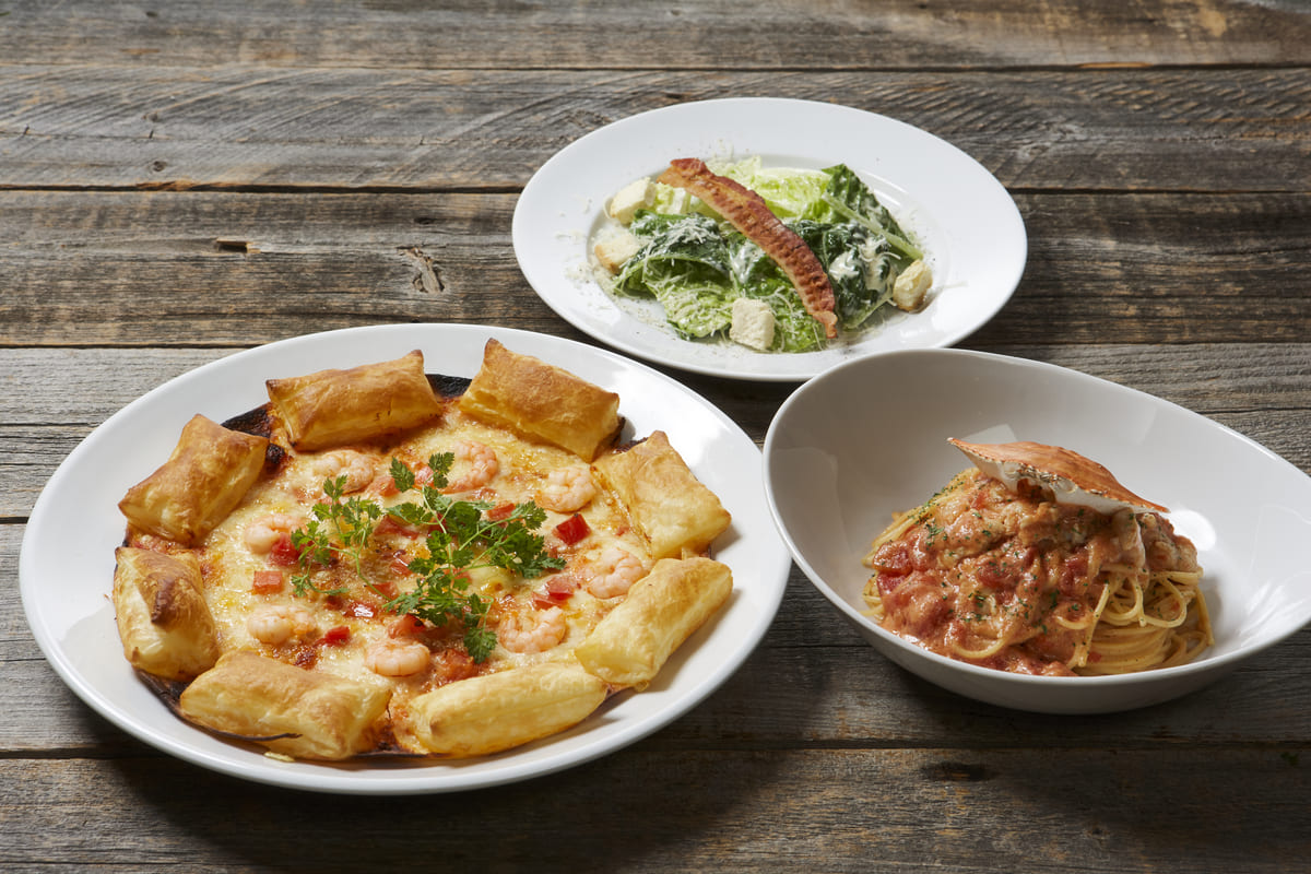 クリスピーパイピザ、ワタリガニのトマトパスタ、シーザーサラダのセット。