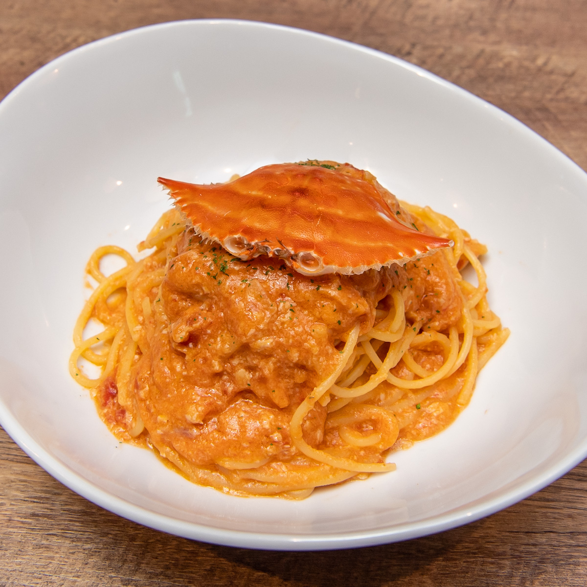 ワタリガニのシェルが乗ったおしゃれな見た目のパスタ。