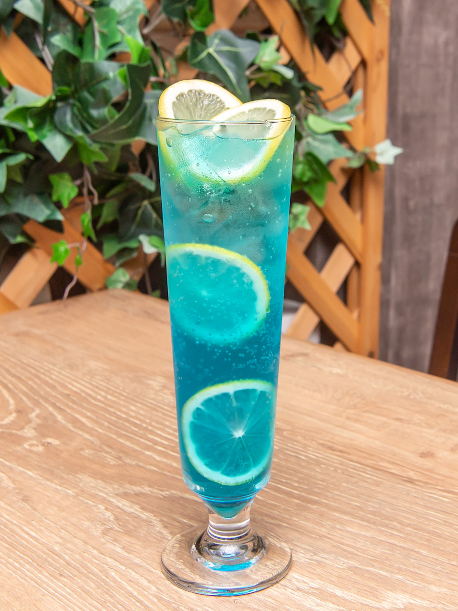 爽やかなブルーのカクテルに、レモンの彩りがおしゃれ!